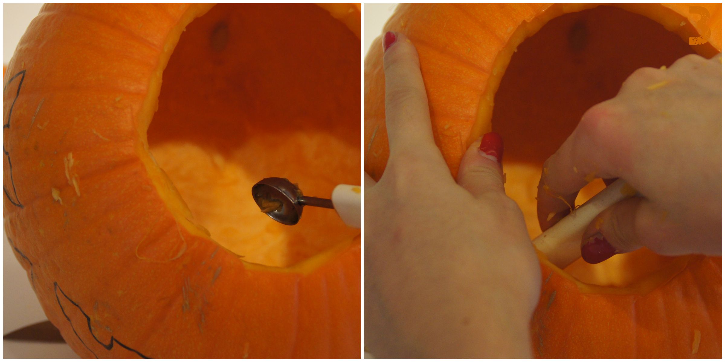 Para la calabaza cortamos en una de las tortitas los ojos, la boca y la parte de arriba dejando una tira que será el rabo de la calabaza.