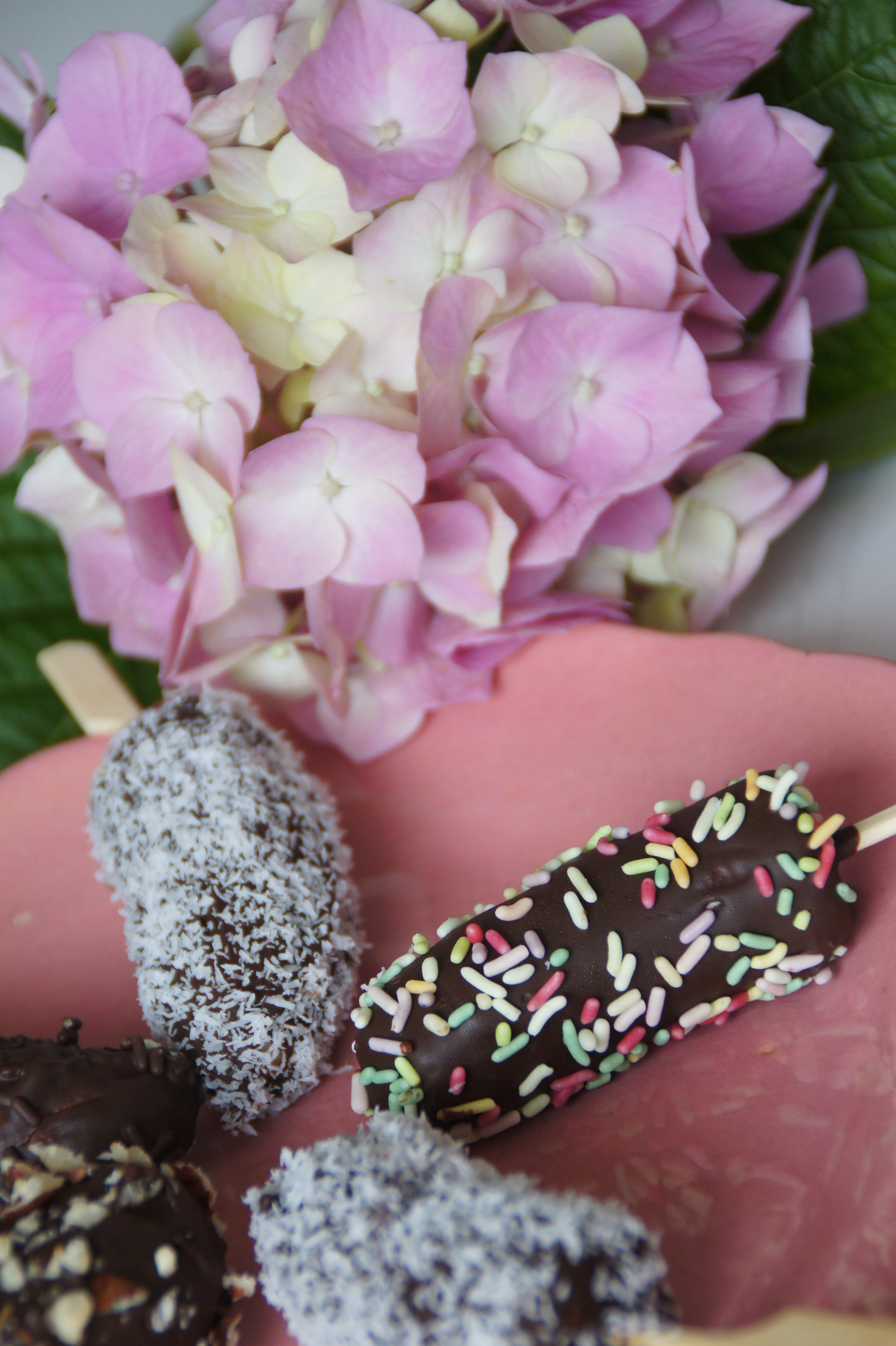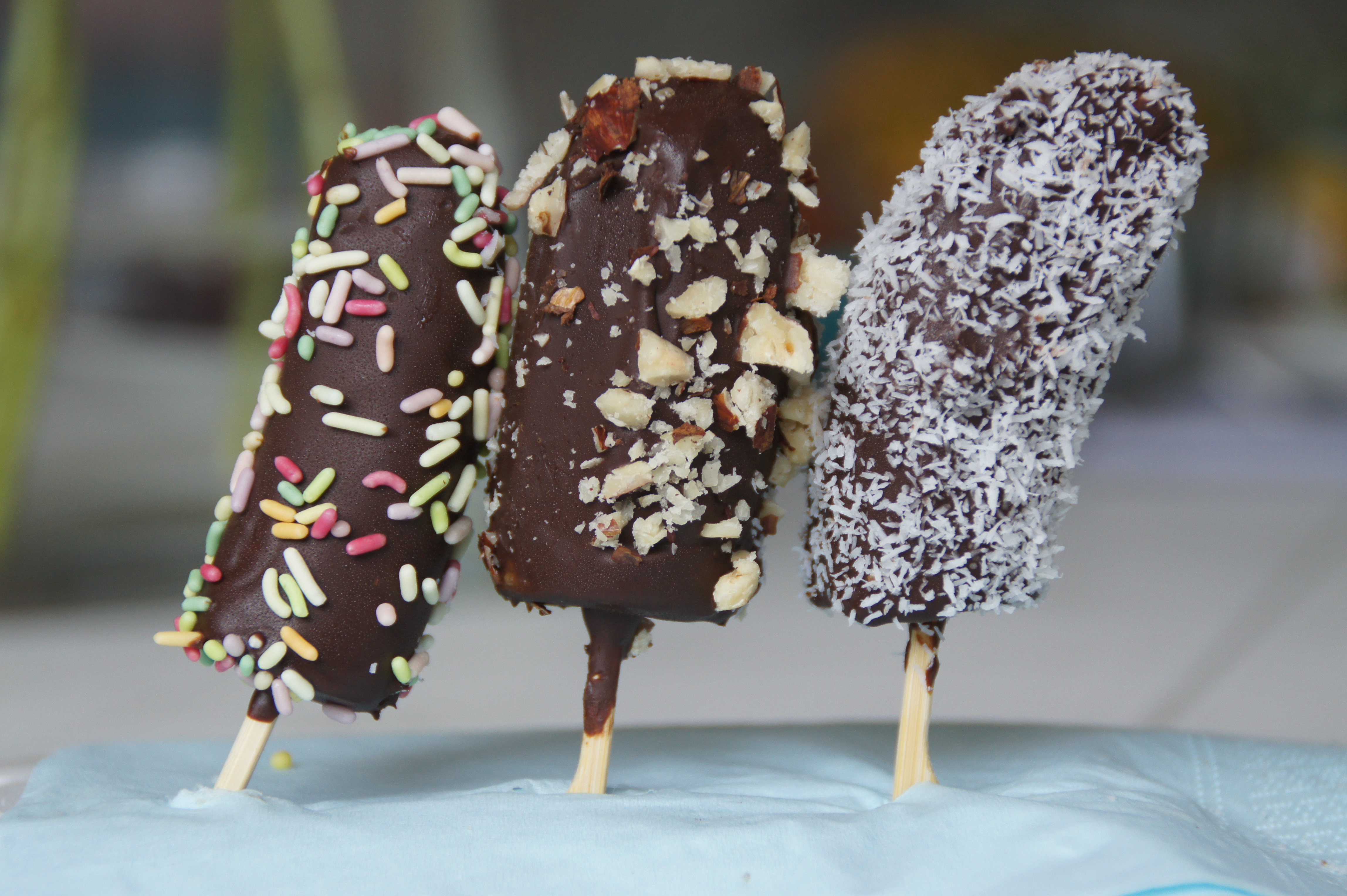 Cover before it dries out with dried coconut, chopped hazelnuts, sprinkles… You can eat them right away or put them back in the freezer again I suggest you to take them out of the freezer 20 minutes before eating them. So that they are not very hard.